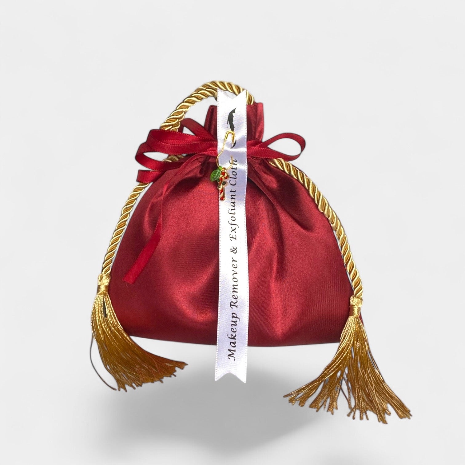 3 small 15x20cm purple cloths in a red cloth bag with tassels and a Christmas charm.